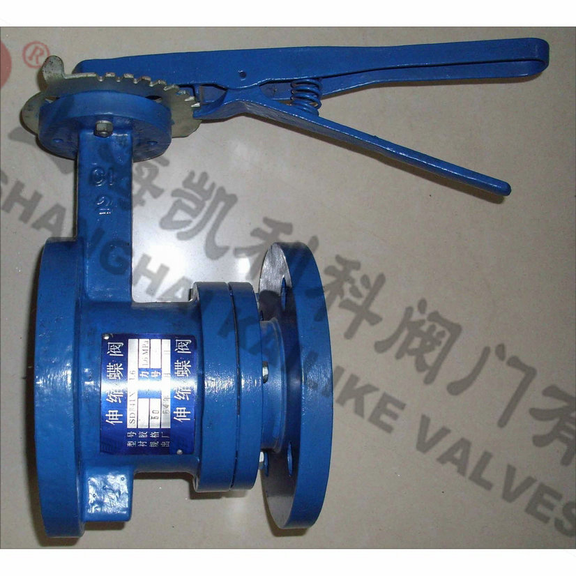 SD41X/SD43H手動伸縮蝶閥具有自動補償管道熱脹冷縮方便裝卸的功能,使用于溫度在425℃以下,公稱壓力在1.6MPa以下的石油、化工、電力、造紙、給排水和市政建設等工業管道上作調節流量和載斷流體的最佳裝置。